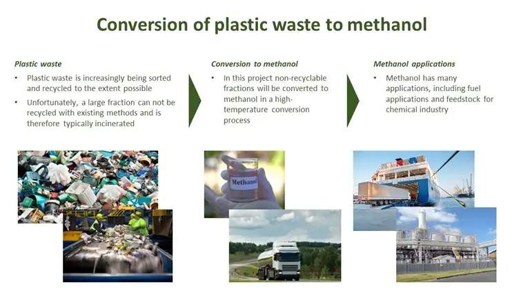 Processen, der skal udvikles, muliggør en stor reduktion i kuldioxidudledninger fra forbrænding af plastikaffald og reducerer behovet for fossile brændstoffer, når skibe og lastbiler drives af methanol.