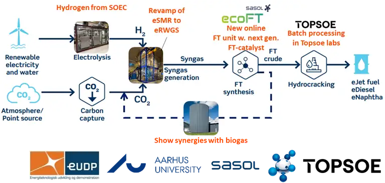 I takt med at ambitionsniveauet for grøn omstilling øges fra samfundet såvel som politisk side, stiger behovet for aktivt at implementere bæredygtige tekniske løsninger. Specifikt for flybrændstof er overgangen til de bæredygtige løsninger markant udfordret af høje omkostninger og en høj risikoprofil kombineret med et krav om høj effektivitet. FrontFuel projektet vil bane vejen for pionererne inden for de bæredygtige flybrændstofproduktionsanlæg ved at demonstrere en ny effektiv værdikæde baseret på CO2 og vedvarende energi som kommer både miljøet og slutbrugeren til gode. En ny syntesegasproduktions-konstellation baseret på SOEC og eREACT™ er potentielt set markedets bedste løsning til CO2 omdannelse. Når denne teknologi kombineres med allerede etableret of certificeret brændstofsyntese via Fischer-Tropsch, muliggøres det at overtage den eksisterende værdikæde for fossilt baseret flybrændstof for derved at kunne bruge processen direkte på markedet. Projektet vil etablere en fuld procesdemonstration ud fra et normaliseret CO2 forbrug på 6 Nm³/h (svarende til 0.5 BPD i et integreret kemisk anlæg med de forventede >95% kulstofs effektivitet), samt analysere processens bæredygtighed i forhold til det fossile alternativ og derved visualisere konkurrencedygtigheden af teknologien.