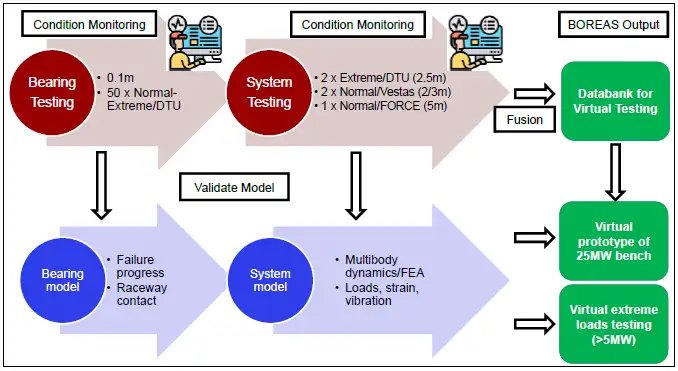 BOREAS løser disse problemer ved at teste og overvåge indvirkningen af raceway-fordybninger på fejlmekanismer i forskellige skalaer og simuleringsmiljøer, med det formål at reducere drift og vedligeholdelses problemer og testomkostninger, efterhånden som vindmøller og lejestørrelser vokser. Nøgleaktiviteter omfatter test af vindmøllevingelejer med en diameter på 2,5 – 5 meter (3 – 15 MW) for at forstå fejlmekanismer, undersøgelse af avanceret tilstandsovervågning og udvikling af en virtuel testmetode.