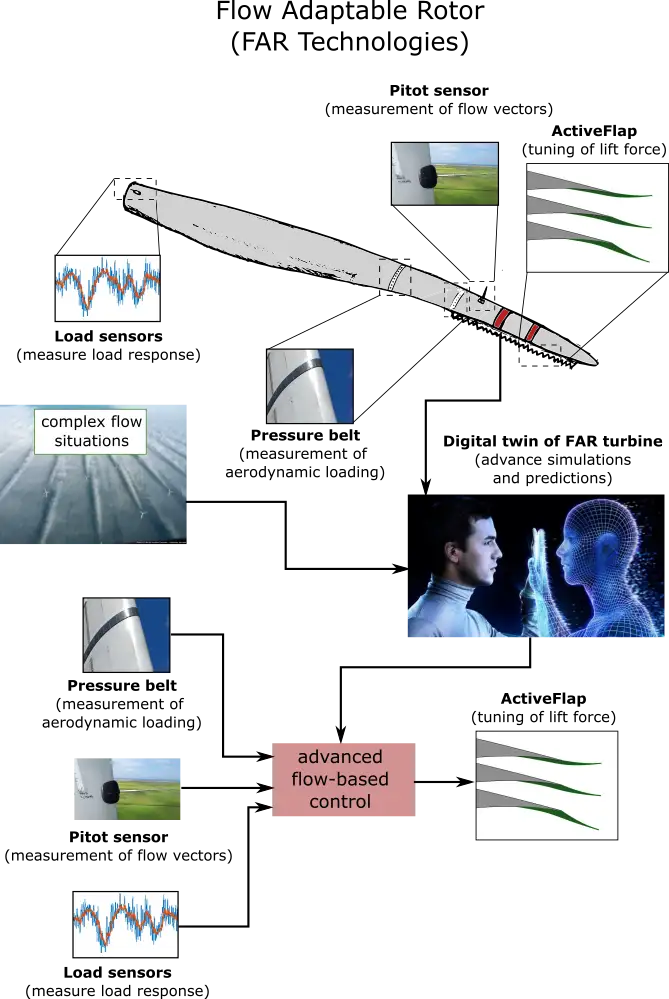 FAR-projektet har til formål at forbedre moderne vindmøller og reducere omkostningerne til vindenergi. Dette opnås ved at udvikle og demonstrere en såkaldt flow adaptiv rotor, dvs. en vindmøllerotor, som hurtigt kan tilpasse sig komplekse atmosfæriske situationer for at reducere den strukturelle belastning af hovedkomponenterne og derved muliggøre design af større og mere effektive vindmøller. Denne flow-adaptiv rotor bruger aktive flow kontrolelementer kendt som aktive flaps, svarende til dem, der findes på flyvemaskiners vinger, for at forbedre forholdet mellem mængden af produceret energi og niveauet af strukturel belastning af hovedkomponenterne af møllen og derved reducere omkostningerne til vindenergi. Til dette formål vil teknologien til aktive flaps blive forbedret og demonstreret på en stor vindmølle i MW skala, avancerede styringsstrategier baseret på den lokale strømnings information vil blive udviklet og demonstreret, den nødvendige instrumentering og valideringsmetoder til at bevise teknologi vil blive udviklet, og endelig vil komplekse flow situationer blive studeret både med simuleringer og eksperimenter, for at vise, at konceptet med en adaptiv flow rotor er gennemførligt. Projektet er yderst innovativt, da ingen vindmøller i verden gør brug af hverken en flowbaseret reguleringsteknologi eller aktive flowreguleringselementer.